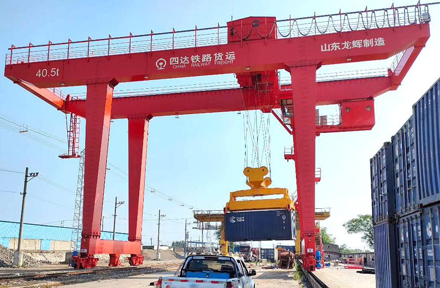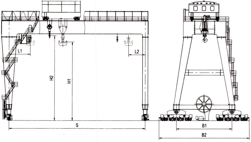 產品介紹:一、產品介紹 門式起重機 是橋式起重機的一種變形,又叫 龍門吊 。它的金屬結構像門形框架,承載主梁下安裝兩條支腳,可以直接在地面的軌道上行走。主梁兩端可以具有外伸懸臂梁...