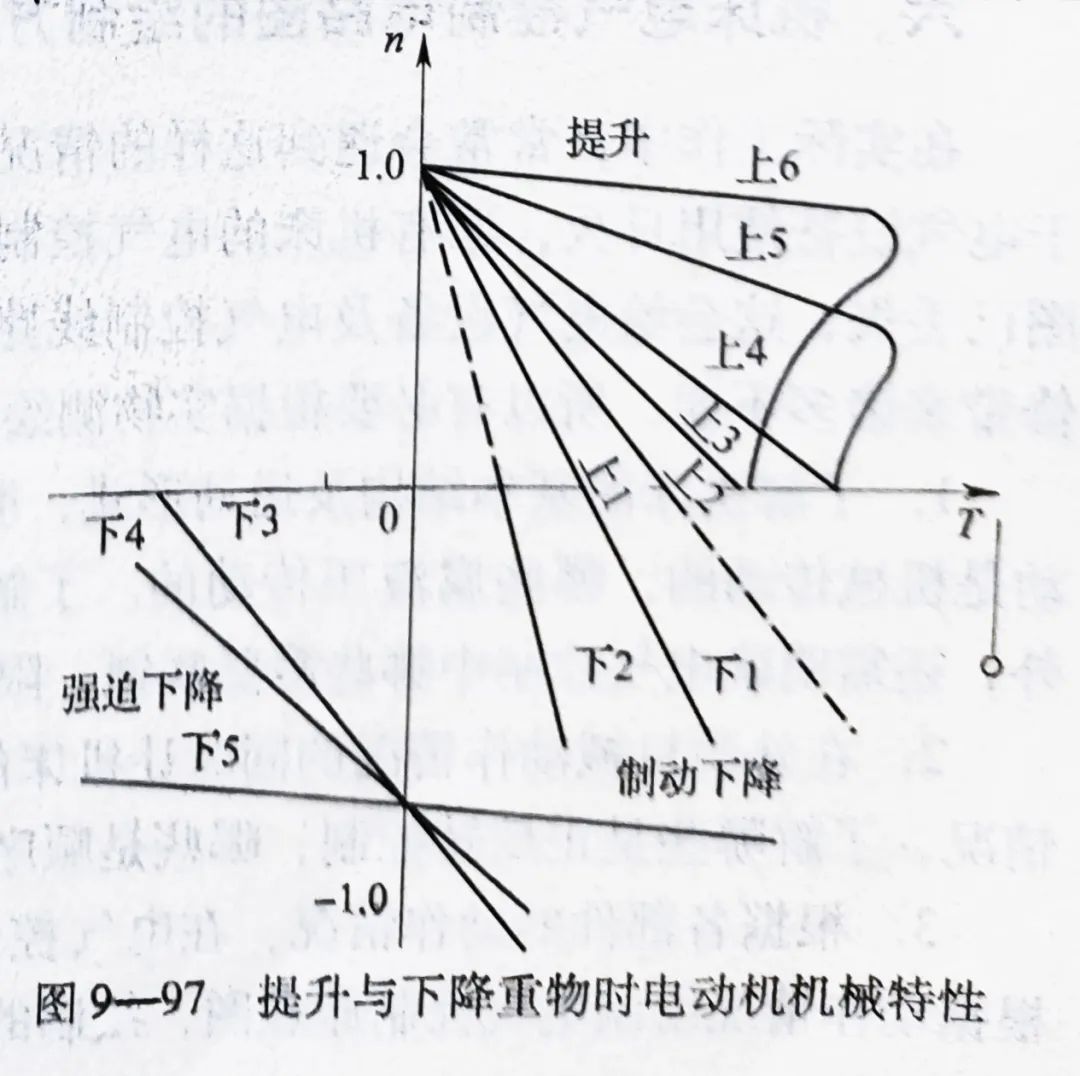 到上升的第2、3、45、6擋位時,接觸器KM5~KM9相繼通電吸合,逐級短接轉子各段電阻,電動機的轉速逐漸上升,獲得如圖9-97所示上2上6機械特性,得到五種提升速度。意數